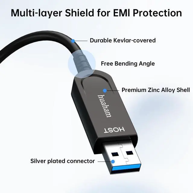 Engineering USB 3.1 Extension Cablehuaham ultra-long fiber optic USB extension cable adopts advanced photoelectric conversion technology, supports data transmission rate up to 10Gbps, ensures zero delay, zero data loss and electromagnetic interference. Optical fiber is softer, faster, lighter, and has better EMI/EMC (anti-electromagnetic interference) technology. ^^ Long-lasting and Durable Quality USB 3.1 Extension Fiber Optic Cable uses 24K gold-plated connectors to prevent oxidation, and the zinc alloy shell has better insulation, better heat dissipation and EMI shielding. The Kevlar fiber covered with four-core optical fibers helps to extend the service life.