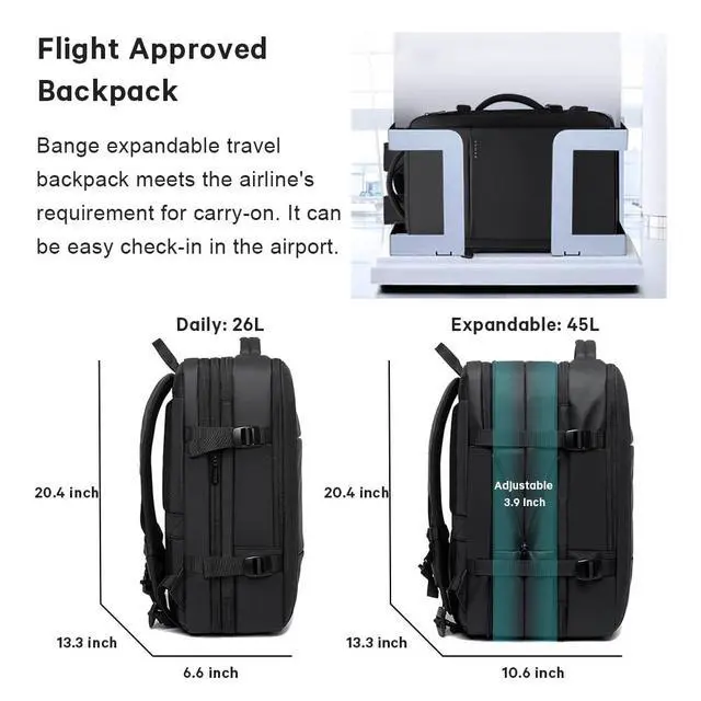 ^^ 26-45L EXPANDABLE DESIGN: Before extended is 26L, dimensions are 20.4 x 13.3 x 6.6 inch; after extended is 45L, dimensions are 20.4 x 13.3 x 10.6 inch. It is perfect for 5-7days daily travel. ^^