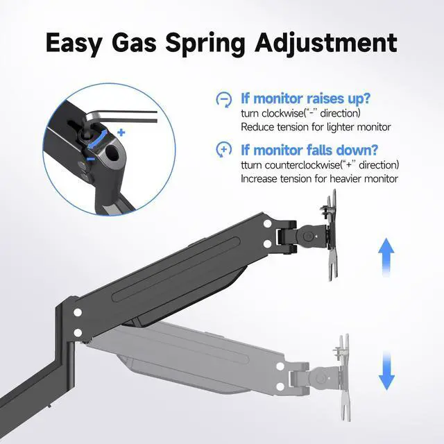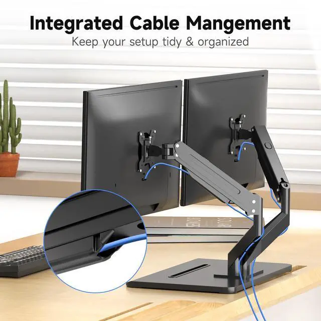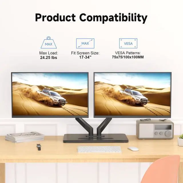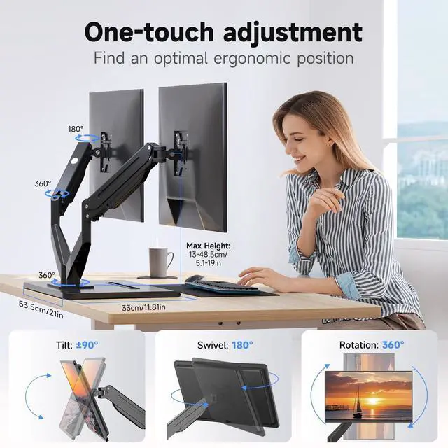 Fits 34" Screens - Suptek monitor mount ideal for most screens up to 34" and 24.25 lbs with 75x75mm or 100x100mm backside mounting holes. The freestanding monitor mount base measures 53.5 cm (L) x 33 cm (W) and features bottom side padding. ^^ No Drilling Required - Unlike C-clamps or grommet bases, the freestanding desktop monitor stand utilizes a large wooden base that requires no drilling for installation and will not damage your desktop. Simply place it on your desk for flexible adjustments and movement for a more comfortable workspace. ^^ Ergonomic Design -The dual tabletop monitor mount is equipped with a high-quality gas spring device, allowing you to flexibly adjust the angle and height of the single desk monitor arm mount stand, rotate 360, tilt 80 up and down, swivel 180 left and right.