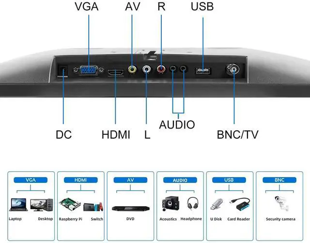 [ 15.6 Inch Portable HDMI Monitor] 1920x1080 FHD monitor 16:9 aspect ratio, LED backlit panel, brightness 350cd/m, built-in dual speakers. 178 Viewing Angle The display can be seen clearly from different angles, perfect as a desktop monitor ^^ [HDMI & VGA &BNC&AV&USB ] interfaces can be connected to computers, game consoles, second monitors for PCs, monitors for Raspberry Pi, bedroom TV monitors, security camera monitors, secondary visual monitors for recording studios, additional screens for game consoles, etc. The system can be connected to a computer, game console, second PC monitor, Raspberry Pi monitor ^^ [Two-way Installation & Remote control ] The portable monitor can be easily mounted on the wall with the industry standard VESA 75 mount (not include) Or mounted on the desktop by provided adjustable mount stand.