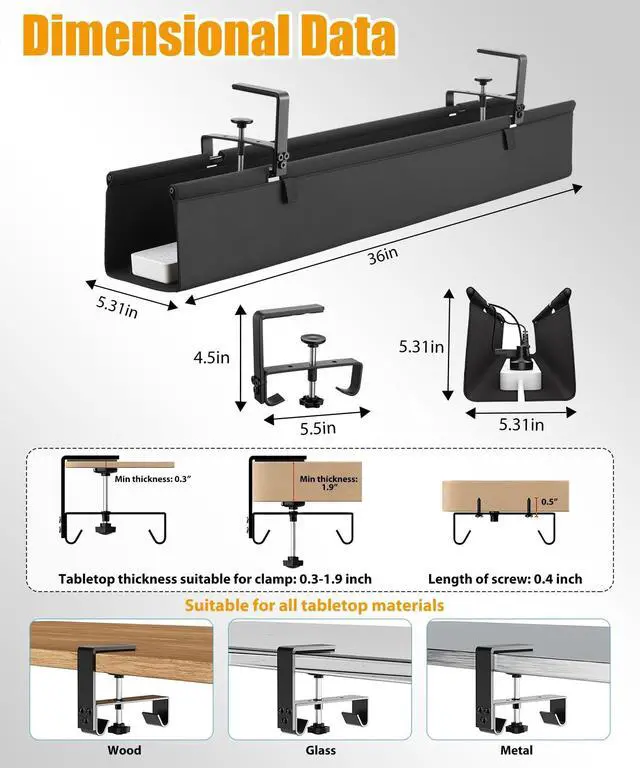 Versatile & Scratch-Resistant Design: Designed to fit desks from 0.3" to 1.9" thick, this under desk cable management tray works on metal, wood, or glass surfaces. It includes protective padding to prevent scratches, making cable management both flexible and safe. ^^