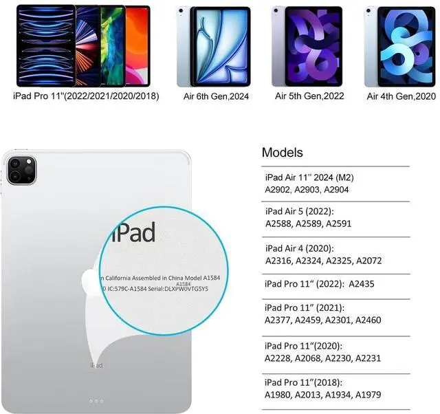 Compatible with: 2024 iPad Air 11-inch M2 (A2902/ A2903/ A2904). 2022 10.9 ''Air 5th. (A2588 / A2589 / A2591). 2020 10.9A ir 4th. (A2324 / A2072 / A2316 / A2325) 2022 11-inch iPad Pro 4th, (A2435, A2759, A2761, A2762). 2021 iPad Pro 3rd. (A2301 / A2377 / A2459 / A2460). 2020 iPad Pro 2nd. (A2228 / A2068 / A2230 / A2231). 2018 iPad Pro 1st. (A1980 / A2013 / A1934 / A1979) ^^ iPad Pro 11 inch & iPad Air 4th/ 5th 10.9 ''