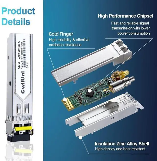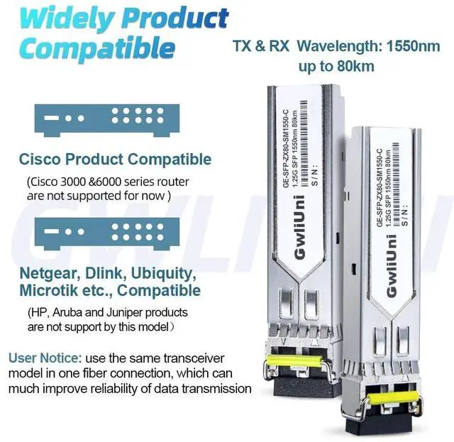 High Performance Single mode duplex 1.25 Gigabit SFP transceiver, supports up to 80km fiber length connection and 0~70 operating temperature. ^^ Widely Compatible The SFP transceiver are widely compatible with Cisco products(Cisco 3000 &6000 series router are not supported) and Netgear, MikroTik, Ubiquity, DLink etc., ( Not recommended for HP, Juniper and Aruba products). The fiber module also works well with switch, router, media converter and more gigabit SFP optic ports ^^ High Quality The shell adopts high density and heat-resistant insulation zinc alloy, high performance chipset, which makes the product more stable and efficient transmission, and low power consumption.
