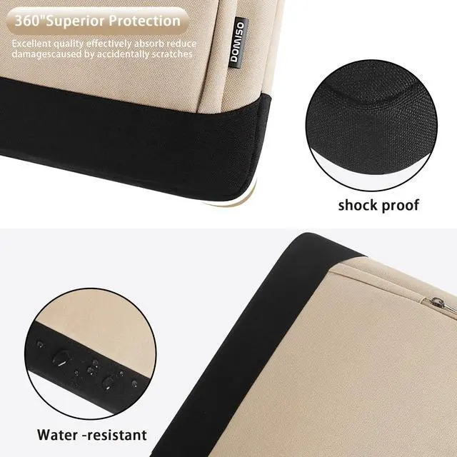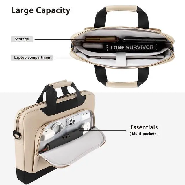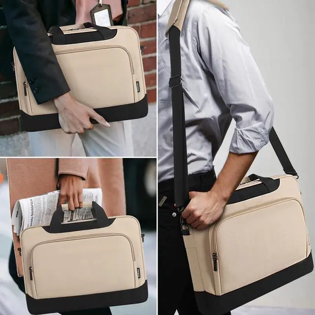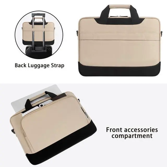 ^^ MULTI CARRYING DESIGNThe laptop sleeve comes with a detachable and adjustable soft shoulder strap, which can relieve your shoulder pressure. And the soft sturdy PU handle can be carried for a long time in a comfortable way. The deliated design with a flat pass-through strap at the back, which allows the briefcase slip over the handle of any luggage case securely for hands-free.