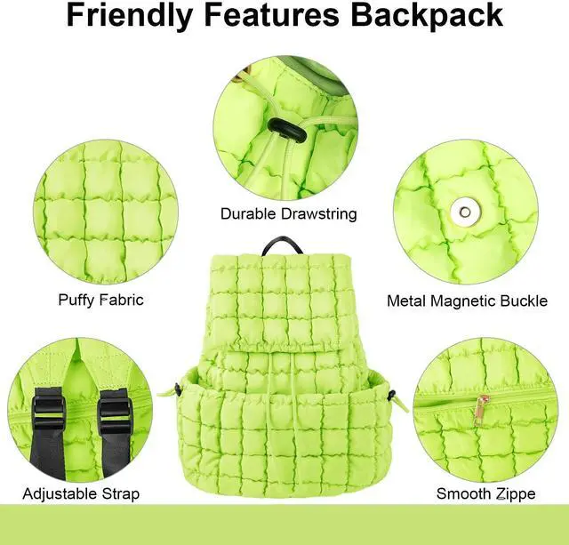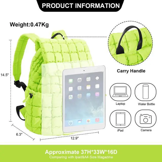 ^^ Large Capacity: Quilted puffer backpack measures 12.9 * 14.5 * 6.3 inches and is spacious enough to hold tablets, books, clothes, cosmetics and more in the main compartment, while hidden zippered pockets on the interior and back further help you keep small essentials organized.