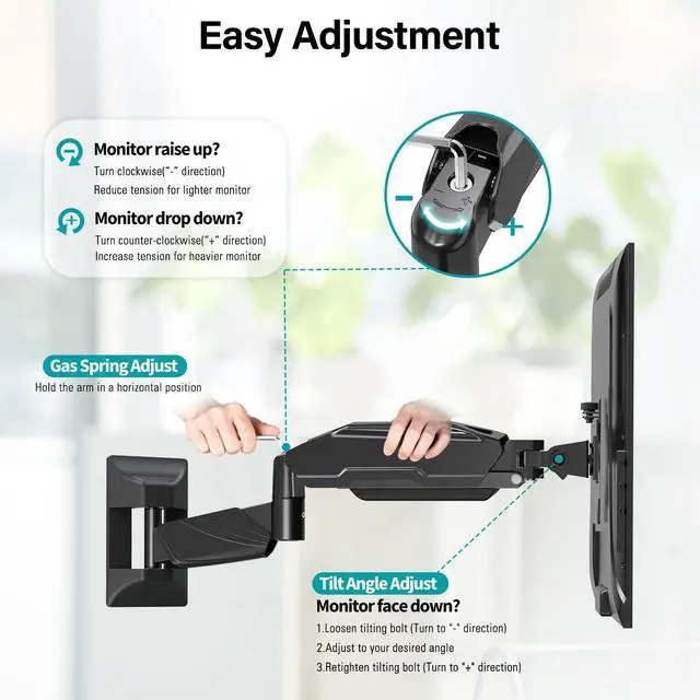 Wall Monitor Arm: This flexible wall mounted monitor arm can extend 21.29" from the wall for optimal viewing from various positions. When you need to save space, it can retract to just 3.53". The monitor arm design and swivel function make the viewing more flexible and versatile, expanding monitor positioning and room layout possibilities. It is an ideal choice for corner placement and you can watch the monitor anywhere you want. ^^ Customize Your