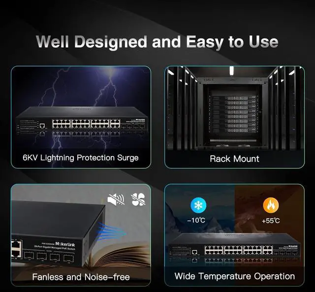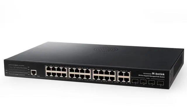 Gigabit Ports: Includes 24 Gigabit PoE ethernet ports, 4 Gigabit Ethernet UpLink, 4 Gigabit Combo SFP Ports. Switching capacity is 56 Gbps, each port can reach 1G rate at the same time, with high speed transmission; 4 Combo SFP UpLink, can be more flexible and long distance to connect to different network devices, support DDM, can check the status of the optical module.