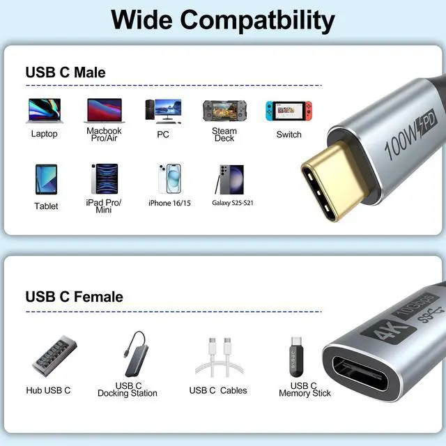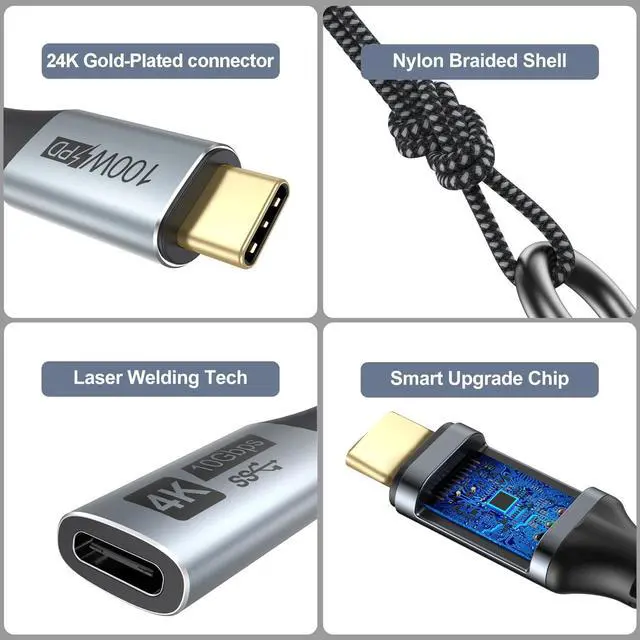 USB C Extension CableUSB C extension cable is designed for extending the connection between devices with USBC port. Simply solve the distance problem by one functional cable, protect the usb c ports from damaging by frequently ejecting, also it helps to efficiently use the USBC port of your laptop to develop and achieve more functions. ^^ 100 Fast Charging/10Gbps DataFull-featured USB C Male to Female Extension Cable works perfectly for max 5A 100W fast charging, 10Gbps data transmission and 4K@60Hz Monitor Video. Moreover, pure copper wire make sure its High-Speed charging and stable data sync.