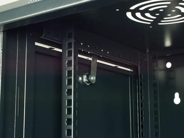 Adjustable rails allow for full customization to allow a variety of networking equipment to fit securely. The rails are punched to allow for the installation of M6 Cage Nuts. Both Side Panels and Front Door are lockable with the included set of keys. Top/Bottom/Rear knockouts for cable entry and exit. All racks are designed to house 19" rack mountable equipment.