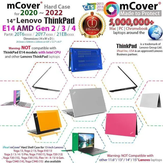 NOTE: Before placing order, PLEASE make sure to verify your laptop model number as this case is MODEL specific and NOT interchangeable. ^^ NOT fitting other 14-inch Lenovo laptops. NOT compatible with ANY other laptops as well. ^^ Made of high-quality translucent polycarbonate material which is shatter-proof and will protect your 2020~2022 14" Lenovo ThinkPad E14 Gen 2 / 3 / 4 (with AMD CPU ) series Windows Computer all around ^^ Designed to perfectly fit the 2020~2022 14" Lenovo ThinkPad E14 Gen 2 / 3 / 4 (with AMD CPU ) series Windows Computer with dimension of 12.76 x 8.66 x 0.7 inch ( 324 x 220 x 17.9 mm ) ^^ 2-piece light-weight ( 10.2 oz or 289 g ) shell easily snaps on and off.