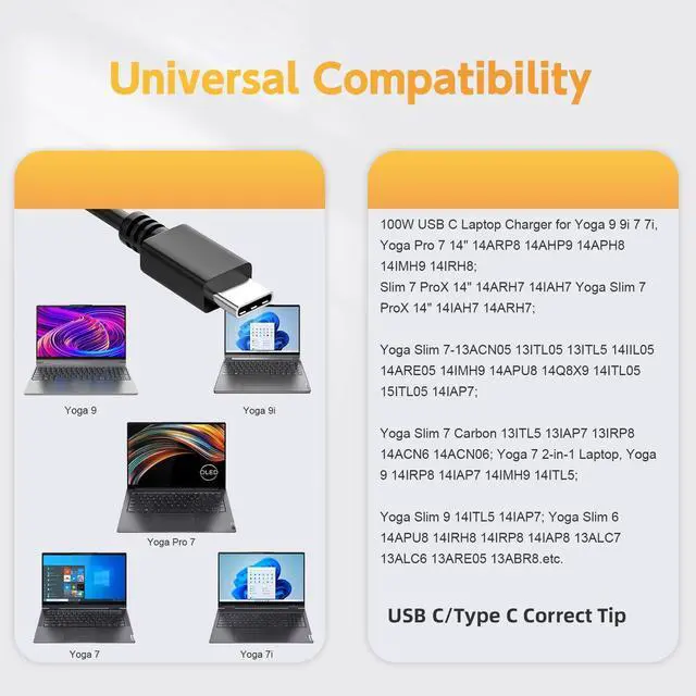 Connector: USB C/Type C. ^^ 100W USB C Laptop Charger Compatible with Lenovo Yoga 9 9i 7 7i, Yoga Pro 7 14" 14ARP8 14AHP9 14APH8 14IMH9 14IRH8; Slim 7 ProX 14" 14ARH7 14IAH7 Yoga Slim 7 ProX 14" 14IAH7 14ARH7; Yoga Slim 7-13ACN05 13ITL05 13ITL5 14IIL05 14ARE05 14IMH9 14APU8 14Q8X9 14ITL05 15ITL05 14IAP7; Yoga Slim 7 Carbon 13ITL5 13IAP7 13IRP8 14ACN6 14ACN06; Yoga 7 2-in-1 Laptop, Yoga 9 14IRP8 14IAP7 14IMH9 14ITL5; Yoga Slim 9 14ITL5 14IAP7; Yoga Slim 6 14APU8 14IRH8 14IRP8 14IAP8 13ALC7 13ALC6 13ARE05 13ABR8. ^^ Compatible with Lenovo Yoga 910-13IKB 80VF Touch, Yoga Miix 720, IdeaPad5 Pro16, Yoga Slim 7 Pro 14IAP7 ThinkBook 13x 14 14s 16p plus g3, ThinkPad T16 P16s P14s L15; ideapad 5-14ALC05, IdeaPad 5 Pro 16ACH6, IdeaPad Slim 7 Pro 16ACH6, IdeaPad Slim 7 Pro 1416 AMD intel etc. ^^ Compatible with Lenovo Laptop ADL100YLC3A, ADL100YDC3A, ADL100YAC3A, ADL100YCC3A, GX21J75543, SA11J62105, SA11D52396, 5A11D52398, ADLX95YCC3A, ADLX95YLC3A, ADLX95YCC2A, ADLX95YLC2A, SA10R16878, O2DL132 14ACH5 14IHU5, GX20M33579, 4X20E75131. ^^ All ROLADA products are CE, FCC and RoHS safety certified with multiple safety protection features.