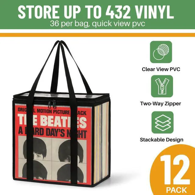 RECORDS: Each of the 12 storage bags hold 36 standard-size records in their cardboard jackets for a total of 432 albums. They are the perfect storage cases to stack on a shelf or in a closet, or slide under a bed for easy, out-of-the-way music collection organization. Sold on for over 7 years ^^