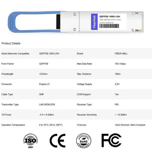 QSFP28 100G100Gigabit Ethernet, coding as Arista Networks QSFP-100G-LR4 ^^ 100GBASE-LR4QSFP28 transceiver module, 100Gbps, single mode, 1310nm, 10km, LC duplex connector, Hot Pluggable, support DOM ^^ ProtocolsIEEE 802.3 bm 100GBASE-SR4 and CAUI-4. Digital diagnostics functions are available via the I2C interface as specified by the QSFP28 MSA. ^^ 3 WARRANTY30-Days Free-returned, 65-Days Free-replacement, 5-Years Free-maintenance ^^ CustomizationFibermall supports regular custom service for your options