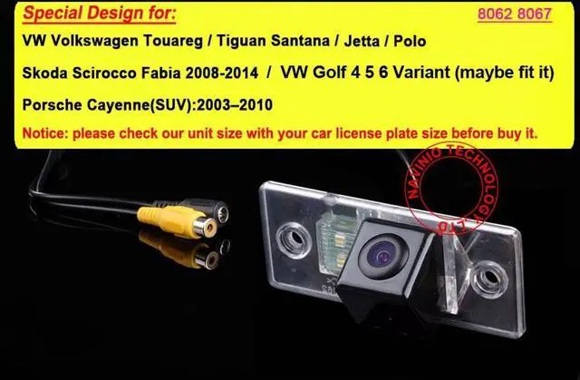 Dear customer, Please must check the camera size and appearance before place a order, see if can fit your car license plate lamp place size and appearance! Because the same car model in different countries may have some difference, please check the camera size and compare the installation of your car carefully to avoid mistake. This product could fit for all below models as expected: For VW Touareg Tiguan Santana Jetta Polo golf4 golf5 golf6 Bora Skoda Scirocco Fabia porsche-