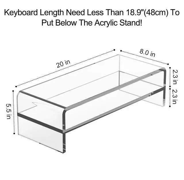 TIER DESIGN&DESK STORAGE: 2 Tier monitor stand design gives the space to store your keyboard, mouse, or some small office supplies like pens, calculator, notebooks, documents and phones. Don't need to worry messy or chaoes on your desk, this 2 tier stand is really very great value! This acrylic monitor stand is long enough to hold most types of keyboards below it (keyboard length need LESS THAN 18.9" ).