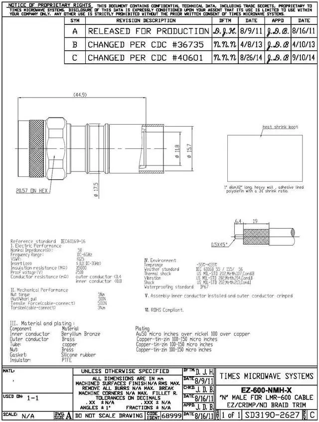 Will work on LMR-600, RFC-600, CNT-600, AX-600 - also will work on the coax cable type LMR-600-DB, LMR-600-FR, and LMR-LW600 ^^ Manufacturer "Times Microwave Systems" is the Industry Leader in Coaxial Connections ^^ Non Solder ( Nmale, N-Male N Male ) connector