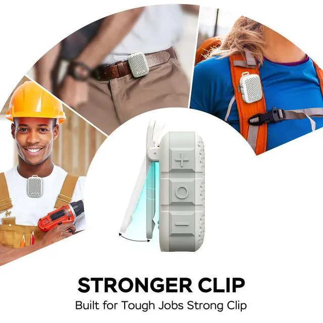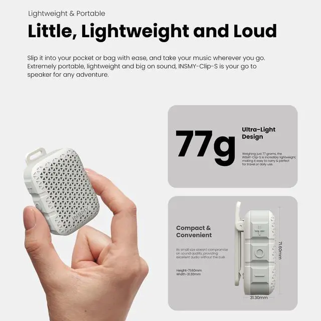 Multi-Functional Wearable Design Experience ultimate versatility with INSMY's clip-on speaker featuring a sturdy carabiner clip and attach back for secure attachment to bags, belts. Perfect for hands-free use during work like welding forklift driving, outdoor adventures like hiking fishing, or daily chores. Combines wearable speaker convenience with industrial-grade clip quality for non-slip wear. ^^ IP67 Waterproof & Rugged Durability Built to withstand tough conditions! This waterproof Bluetooth speaker boasts IP67 waterproof rating, surviving rain, spills, or accidental submersion (up to 30 mins). Ideal for construction sites, workshops, or lakeside fishing trips.