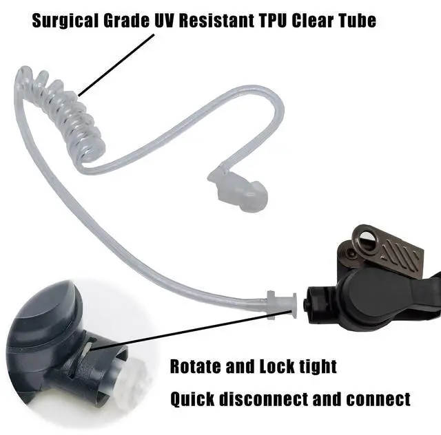 Earpiece acoustic tube with surgical grade uv resistant TPU clear tube, comfortable and durable, protect against radiation. ^^ This radio earpiece PTT with high quality microphone, sound performance without distortion, fix the PPT and mic to the place you want with the fixed clip. ^^ Fins earmolds anti-slip soft comfortable, wearing 24 hours no pain. ^^ Transparent acoustic tube transmit in high quality, the surveillance earpiece speaker excellent audio quality. ^^ Compatible with perfect match Motorola two way radio earpiece police radio device.