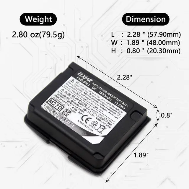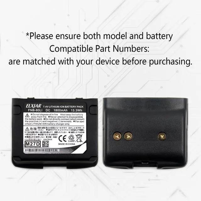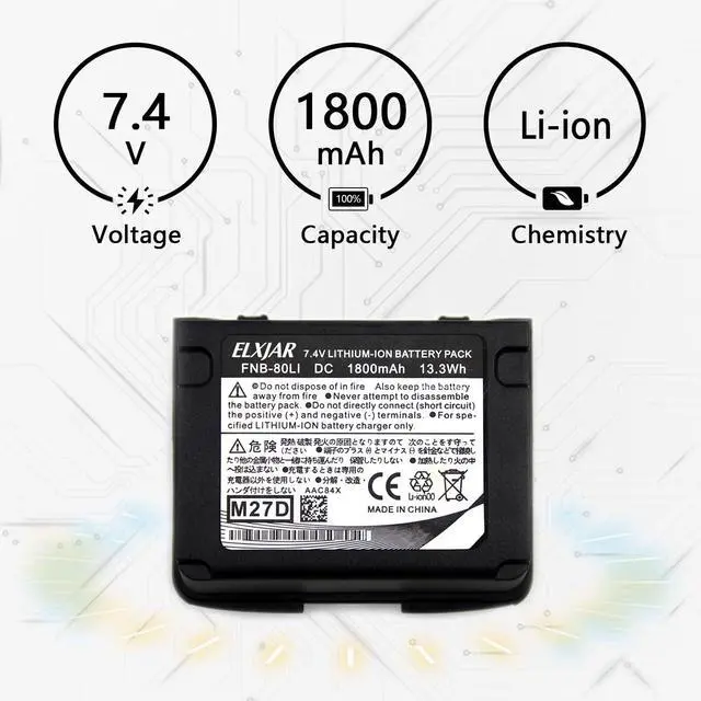Product Overview: The elxjar 7.4V 1800mAh Li-ion replacement battery offers a powerful solution for users of Yaesu and Standard Horizon radios. Engineered as a direct alternative to OEM part numbers FNB-58, FNB-58Li, FNB-80, and FNB-80Li, this battery guarantees compatibility and dependable power, making it a practical choice for radio operators requiring consistent performance and longer operational times.