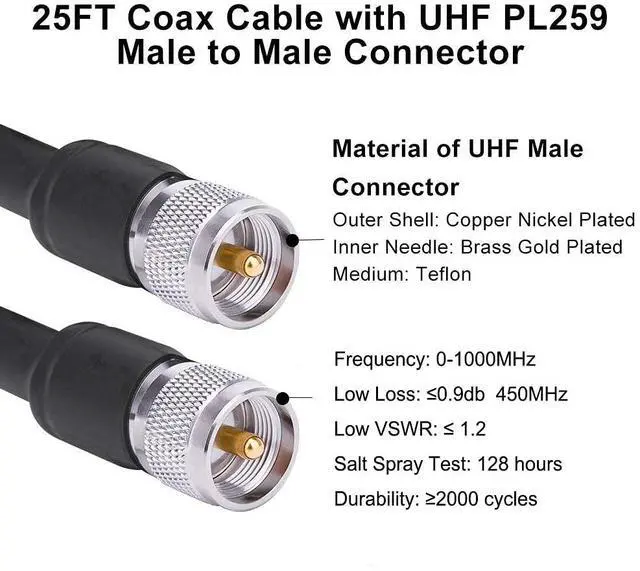 LOW LOSS - The loss of 25ft KMR400 pl259 coaxial cable at 450MHZ signal frequency is less than 0.85 dB and the SWR 1.25. It is a low loss uhf coax cable with PL259 plugs on the both ends. There is no need to worry about signal loss for long-distance high-frequency use. ^^ Well Built Structure- The inner conductor of this pl259 cable is made of copper clad aluminium, and the outer conductor is made of Aluminum foil and tinned copper braid which could maximum protect the signal over large distance. This KMR400 coaxial cable is equivalent to lmr400 and rg8u.