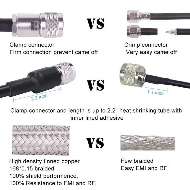 ^^ Prevent Fall Apart or Break- Connection between UHF male connector and KMR400 coaxial cable end is equipped with a 2.2" heat shrink tube with lined adhesive which is longer than other cable 's 1.1 heat shrink tube. And the connector is use clamp design. UHF connectors are well integrated into the cable to avoid easy breakage during use. ^^ Great Quality and Durable - The jacket of this cb cable is made of PVC, which is waterproof. The connector shell made of copper nickel plating has good corrosion resistance. The shrink tubing of this jumper is built with an adhesive inner wall, sealing against moisture.