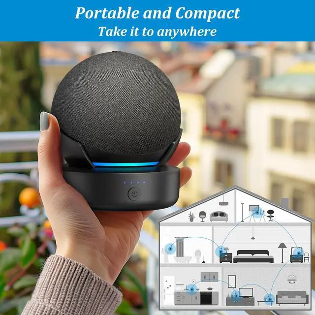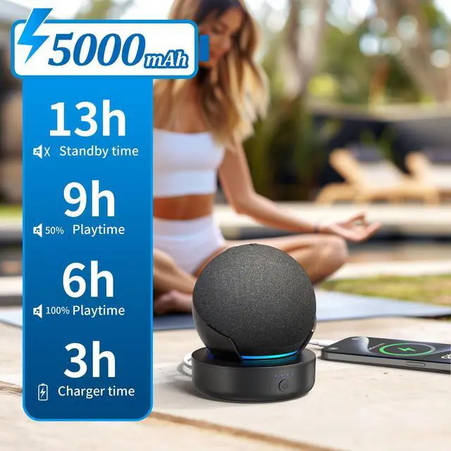 Really Make A Dot Portable: No more tethered to the wall. No need to connect to a mains supply. Our charging base is lightweight and completely portable. You can move it room to room, and take it to the patio, pool, beach and out in the garage. You can also set up it as a stereo pair when having a party outside or enjoying a summer evening ^^ Long Lasting