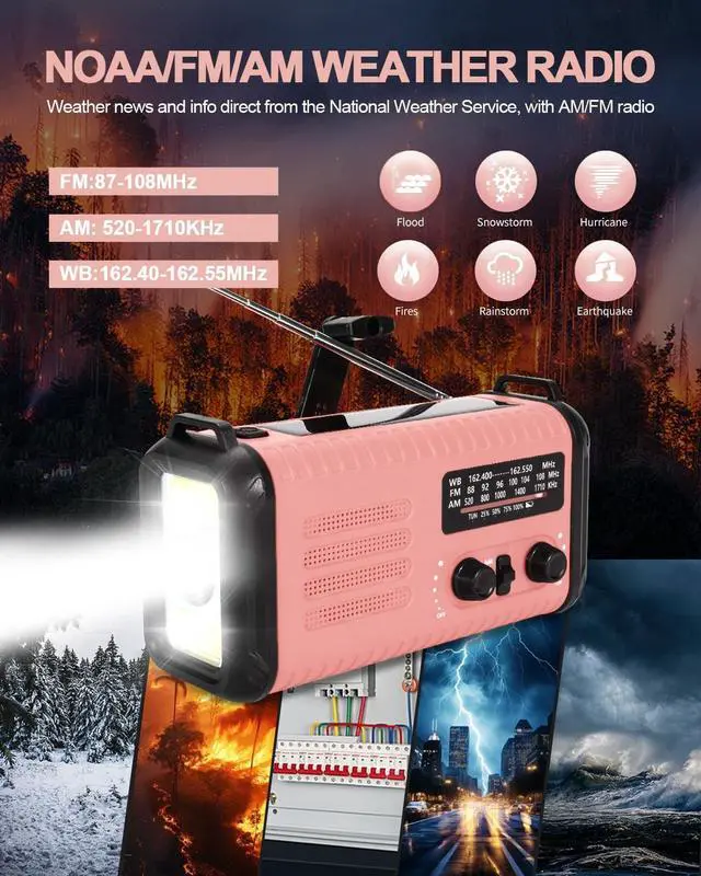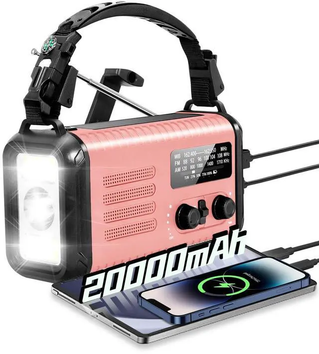 Emergency Crank Radio, 20000mAh / 74000mWh Solar Hand Crank Weather Radio with NOAA/AM/FM, Battery Powered Radio with Cell Phone Charger, Reading Lamp, Flashlight & SOS for Emergencies/Home (Pink)