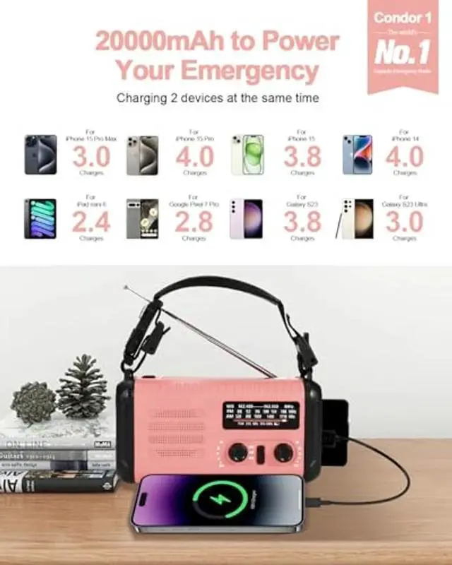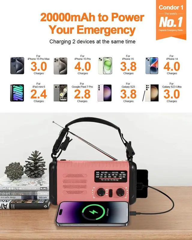 LARGEST BATTERY CAPACITY - iRonsnow Condor 1, The world's No. 1 capacity emergency radio 20000mAh, The large battery capacity can charge multiple mobile devices and also supports charging 2 devices at the same time. When a crisis strikes, it can even help the entire family avoid the risk of power outage. ^^ NOAA WEATHER RADIO - As the global climate continues to worsen, we increasingly need more powerful life-saving radios. This noaa weather radio comes with clear sound from 7 NOAA stations to receive the latest weather and all hazard information for your area, such as hurricanes, tornadoes, and more.