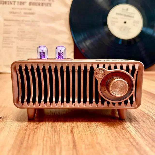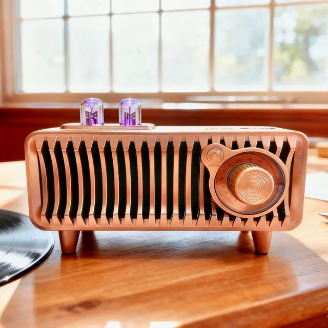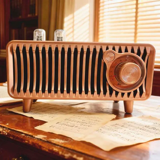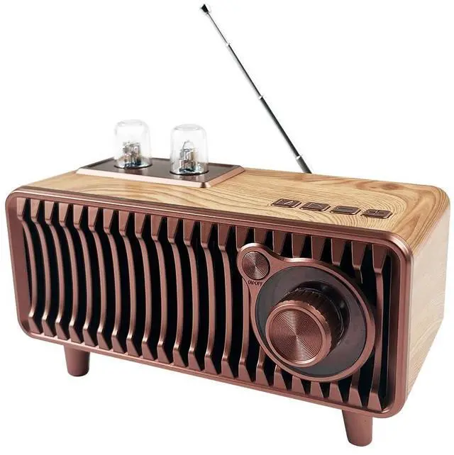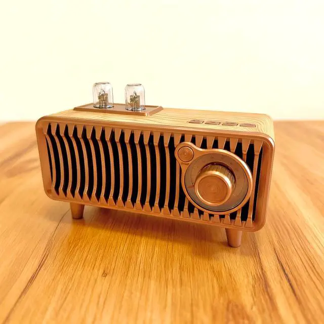 Experience the perfect blend of vintage aesthetics and modern technology with this portable Bluetooth speaker. Designed to evoke the classic charm of retro radios, this speaker features a beautiful wooden finish complemented by an elegant copper-toned metal grille. The Bluetooth 5.1 technology ensures a stable, high-quality connection with your devices, while the dual-speaker system delivers rich, room-filling sound with impressive bass response. Perfect for both indoor and outdoor settings, this versatile speaker adds a touch of nostalgia to your home office or becomes the centerpiece of your next outdoor gathering. The thoughtfully designed exterior includes intuitive controls and a convenient carrying handle, making it both functional and portable.