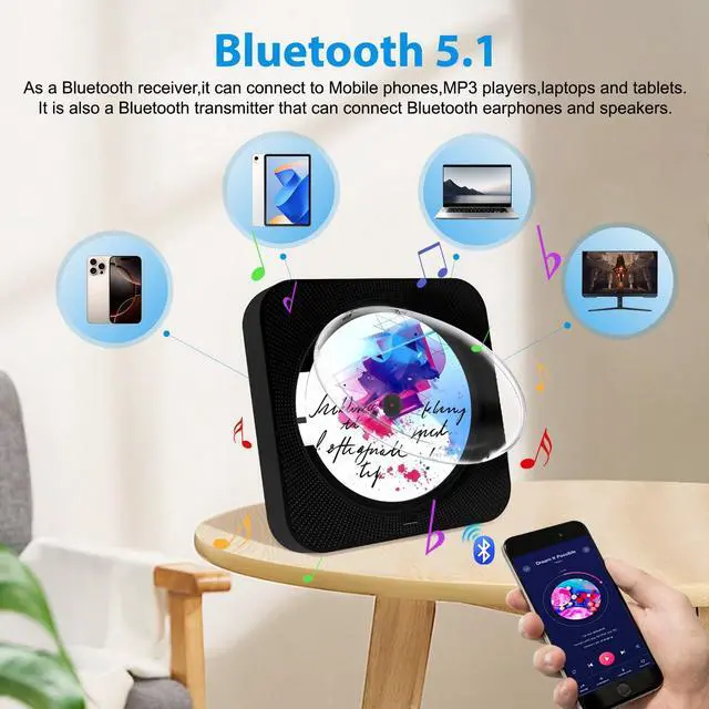 ^^ Bluetooth 5.1T his small CD player boombox is equipped with bluetooth 5.1 and has dual sending and receiving functions. As a fm transmitter bluetooth, the audio played from a CD can be converted to a bluetooth signal in real time and transmitted wirelessly to a bluetooth headset or speaker; As a receiver, The CD player bluetooth can receive audio signals from mobile devices such as mobile phones. The portable bluetooth CD player can not only listen to music with CD/USB/TF card, but also connect bluetooth signals from mobile phones and tablets to play wireless music as a speaker.