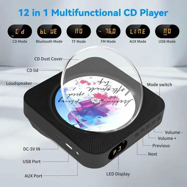 Multifunctional CD PlayerThe CD player features CD, Bluetooth 5.1, USB, TF, AUX playback, 3.5 mm Aux & headphone jack, FM radio, timer, dust cover and remote control, etc. The portable CD players is widely compatible with CD, CD-R, CD-RW, MP3, WMA other five CD formats. This radio CD player is also equipped with a remote to conveniently control the player even if you are not nearby. This multifunctional music player not only retains the ceremonial feel of traditional CD playback, but can also be used in various environments such as gatherings, studios, massages, yoga, and home education.