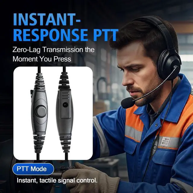 Boom Mic & PTTRotated and adjustable boom mic with noise-reducing sponge can be adjusted to a appropriate distance for the clear voice transmission.With the push-to-talk function, the one side overhead headset can be easy to operate t