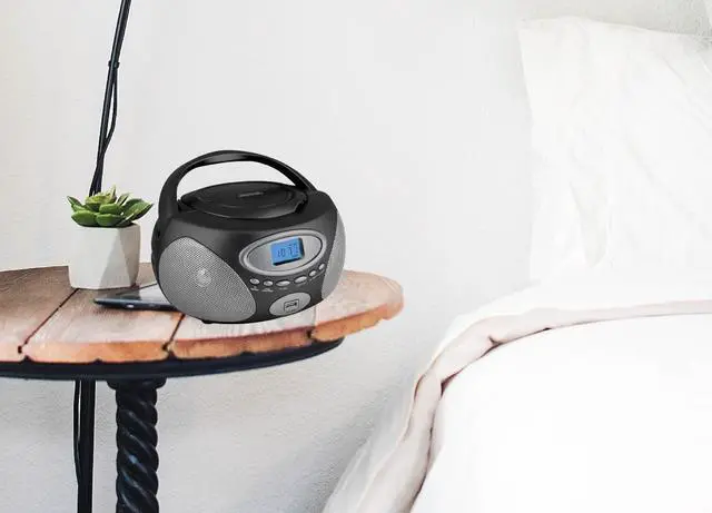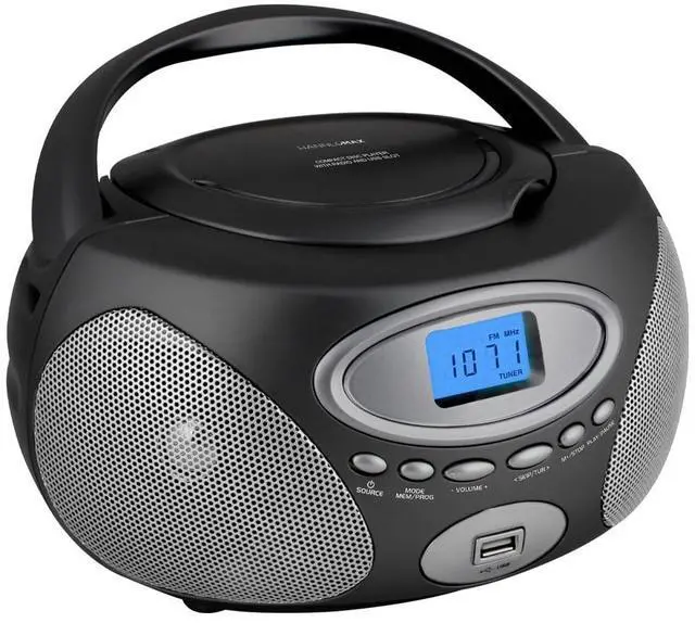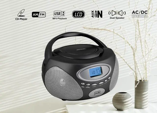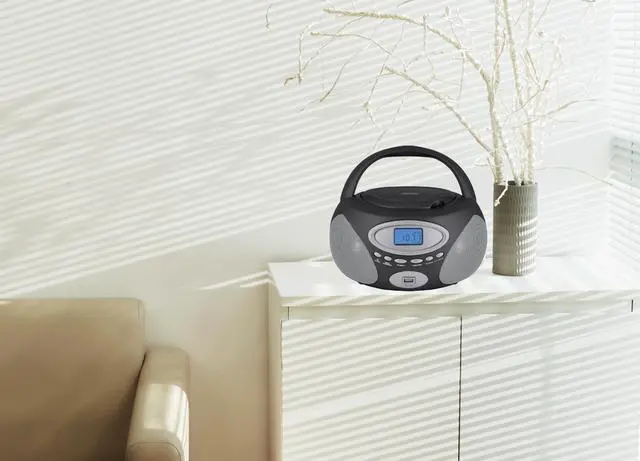 This product is a simple portable boombox with compact and modern design. The top CD player supports CD, CD-Rs CD-RW and MP3disc with programmable function. AM/FM radio stations can easily be located with a digital scan so you can start listening to your favourite station by the preset functions. USB Port Play your favourite MP3 music on a USB flash drive through USB port. AUX IN Plug and play. Simply plug in via 3.5 mm jack and play your favourite music from your smartphone or tablets with AUX connectivity. LCD Display with Backlight Clear LCD display for ease of use.