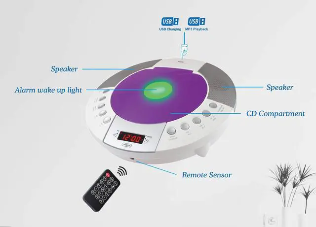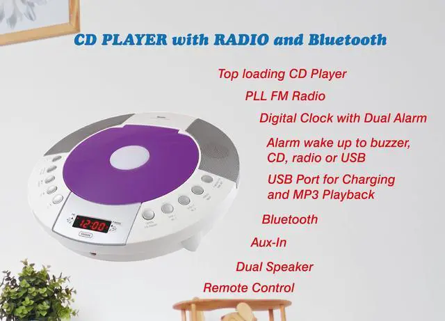 CD Player with PLL FM Radio, Digital Clock with Dual Alarm, Alarm Wake Up to Buzzer, Radio or CD, Red LED Display, Bluetooth, 1 USB Port for 1A Charging and MP3 Playback, Aux-in, Dimmer Function, Memory backup, Remote Control Included.