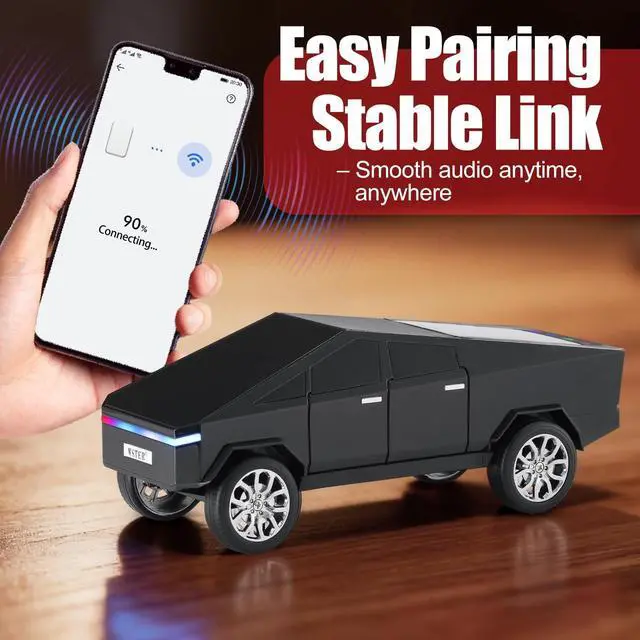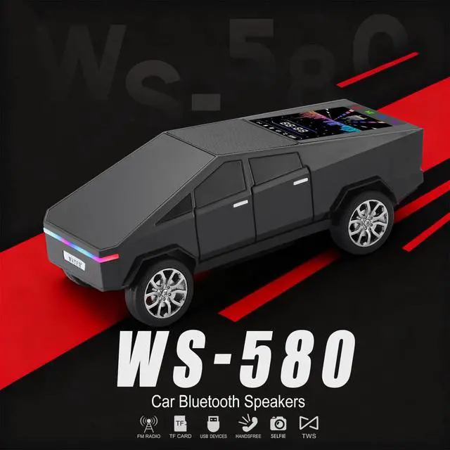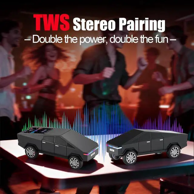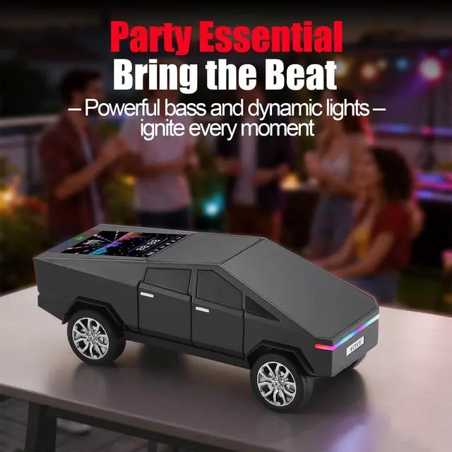 Pickup Truck Style Construction Model-inspired body with defined lines and rolling wheels. ^^ LED Display Screen Information Shows playback mode and connection status clearly. ^^ Multiple Audio Input Options Bluetooth streaming, USB drive, TF card and FM radio. ^^ TWS Wireless Stereo Support Pair two units for left-right channel output. ^^ Built-in Microphone & Type-C Charging Hands-free calls and modern charging connection.