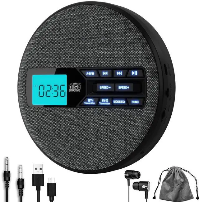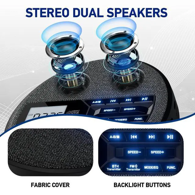 with 5 sound effects: BLT, POP, ROC, JAZ, and CLA, and is built-in with an upgraded 1500 mAh lithium polymer rechargeable battery ^^ Last Memory & A-B RepeatThis cd player with speakers remembers the last playback position, resuming from where you stopped. Use the "A-B" repeat function to replay specific sections without manual adjustments, perfect for learning melodies or enjoying favorite tracks ^^ Upgrade Your Car Audio ExperienceThis portable cd player with bluetooth enjoys wireless music via the built-in FM transmitter or wired playback using the included 3.5 mm AUX cable. Perfect for enjoying crystal clear sound in the car ^^ Anti-Skip & Backlit ButtonThe cd player bluetooth equipped with anti-skip protection, it ensures smooth playback even on the move. The backlit button make operation easy and add a premium feel, enhancing usability in any lighting condition ^^ 10 Adjustable Speeds & Fabric DesignThe bluetooth cd player Freely adjust playback speed from slow to fast for different needs. Its refreshed fabric design, with a soft and textured surface, adds a cozy and artistic touch to your home ^^ Widely Used & Ideal GiftPerfect for language learning, audiobooks, bedtime stories, and more, this small cd player fits any room.
