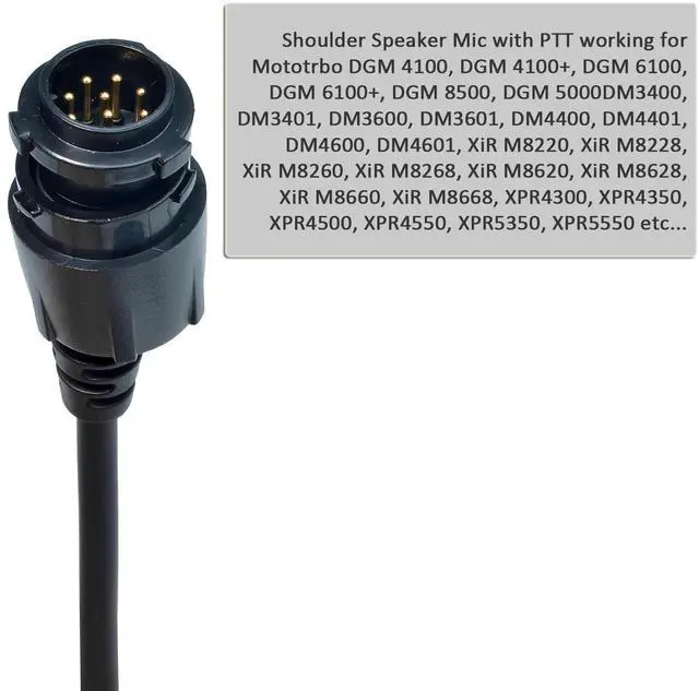 Shoulder Speaker Mic with PTT working for Mototrbo DGM 4100, DGM 4100+, DGM 6100, DGM 6100+, DGM 8500, DGM 5000DM3400, DM3401, DM3600, DM3601, DM4400, DM4401, DM4600, DM4601 ^^ Remote Speaker working for Motorola XiR M8220, XiR M8228, XiR M8260, XiR M8268, XiR M8620, XiR M8628, XiR M8660, XiR M8668, XPR4300, XPR4350, XPR4500, XPR4550, XPR5350, XPR5550 etc... ^^ Durable design, Heavy duty cable, Durable outer casing protects against blowing rain to ensure transmission clarity.