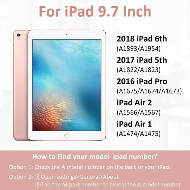 ONLY for iPad 9.7 inch is compatible with 2018 iPad 6th generation (A1893/A1954), 2017 iPad 5th generation (A1822/A1823), iPad Pro 9.7 (A1673/A1674/A1675), iPad Air 2 (A1566/A1567). Please check the back bottom of your iPad to find the model number before placing order.