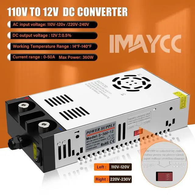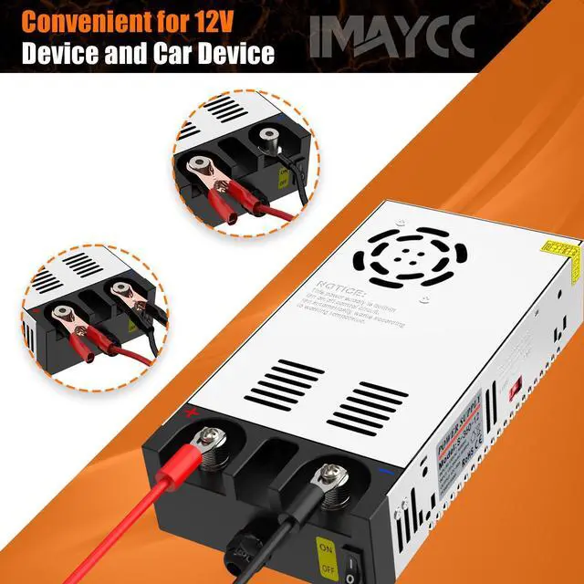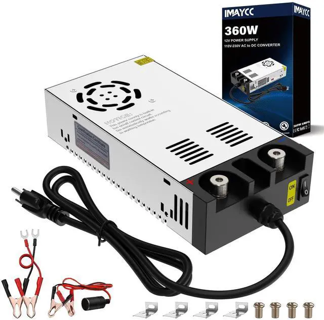 12V 360W Power SupplyThis DC Converter include 2 sets copper Clamps and wires, it will be easy to connect the 12V Diesel heater, Car Stereo and Car Cigarette Lighter Socket Device; With on/off switch, more safe and convenient power start/stop operation ^^ AC to DC Converter 12VAdjustble Input voltage, Choose AC 110V or AC 220V; Output Voltage is DC 12V and Output Amps Mainly depends on your decive, such as 10A 120W, 20A 240W, 30A 360W. ^^ Effective CoolingEquipped with a built-in cooling fan, this converter is highly reliable, even within a temperature range of 14 to 140F.