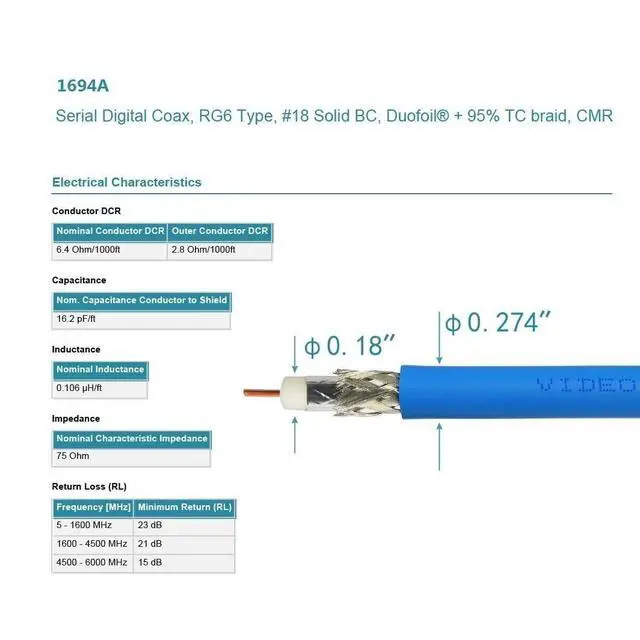 Cable Type: Belden 1694A; 18 AWG^^Standard Definition SD-SDI (270 Mbps, ST 259) HD standard HD-SDI ( 1.483 Gbps, ST 292)3G-SDI ( 2.97 Gbps, ST 424) 6G-SDI ( 5.94 Gbps, ST 2081) 12G-SDI ( 11.88 Gbps, ST 2082) ^^ BELDEN 1694 PRECISION SERIAL DIGITAL VIDEO COAXIAL CABLE: features exceptionally low attenuation and a 4.5 GHz Bandwidth in an RG6 type coax cable. Featuring RG-6/U type, 18 AWG solid. 040" bare copper conductor, Gas-injected FHDPE - Foam High-Density Polyethylene + tinned copper braid shield (95% coverage tinned copper braid combined with Duofoil foil/poly/foil 100% shield), PVC - Polyvinyl Chloride. ^^ Is suitable for HDTV and professional