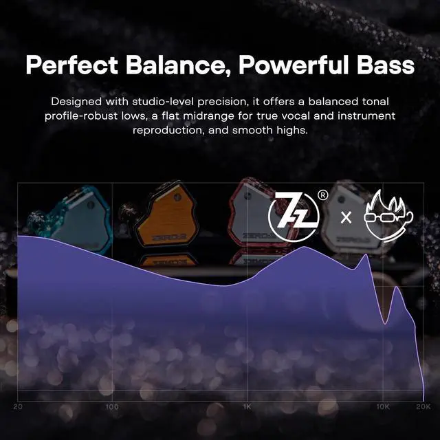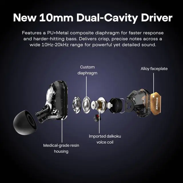 [- - ] Experience studio-grade audio with a 10mm dynamic driver that delivers powerful bass, crisp mids, and sparkling highs. With an upgraded PU Metal composite diaphragm, this allows for heavier bass while maintaining crispness and precision in every note. With a wide frequency response (10-20,000Hz) and <1% THD (Total Harmonic Distortion), every note stays true to the original recording, the zero:2 iem is perfect choice for music lovers, gamers, and audiophiles who demand premium sound quality.