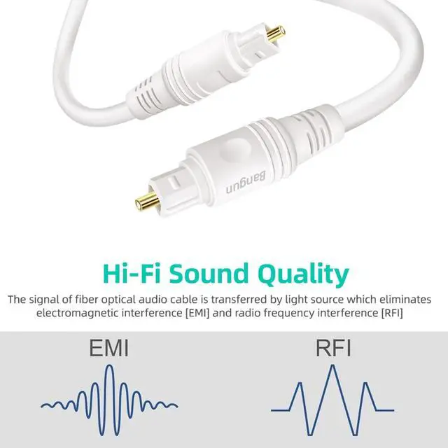 Superior Sound Quality - Bangun white digital audio optical cable features corrosion-resistant, gold-plated connectors and buffer tubing for optimal signal transfer. Clear uncompressed PCM audio and compressed 5.1 to 7.1 surround sound systems including Dolby Digital Plus, DTS-HD High Resolution and LPCM. It is the high resolution digital cable with Standard Toslink connectors offer the most acurate digital audio signal transfer for maximum audio clarity and resolution