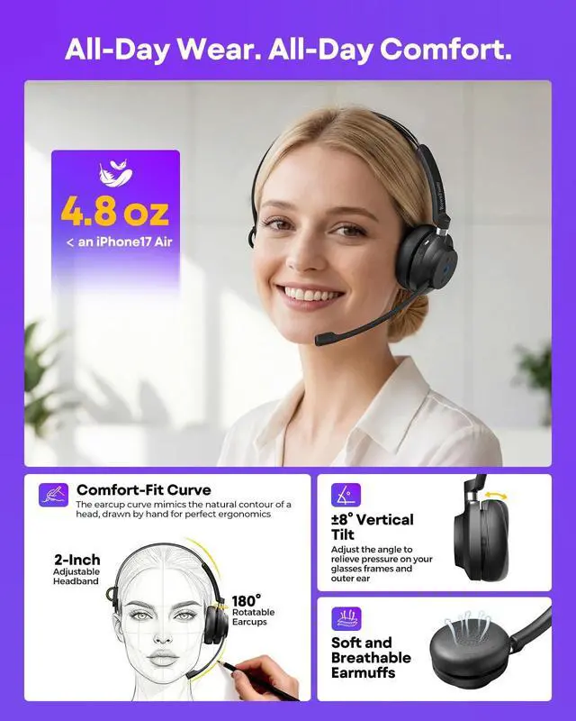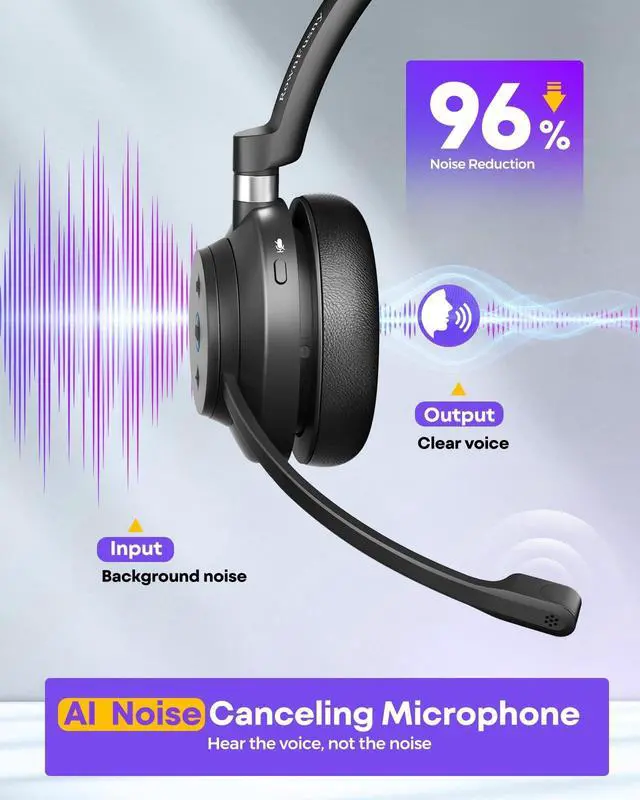 ENC Noise CancellationThis wireless headset with microphone features ENC noise cancellation to reduce background noise for clear calls. The headphones with microphone features Dynamic EQ that keeps voices natural during meetings and automatically switches to stereo sound for music or videos. With DSP noise processing, voice calls and media playback remain clear in the office, at home, or in a meeting. ^^ Provide Ergonomic ComfortThis wireless headset with mic combines a TPE steel headband and protein leather ear cushions, built with aerospace-grade materials. The headband distributes pressure evenly, and the ear cushions conform to the ear for a stable fit.