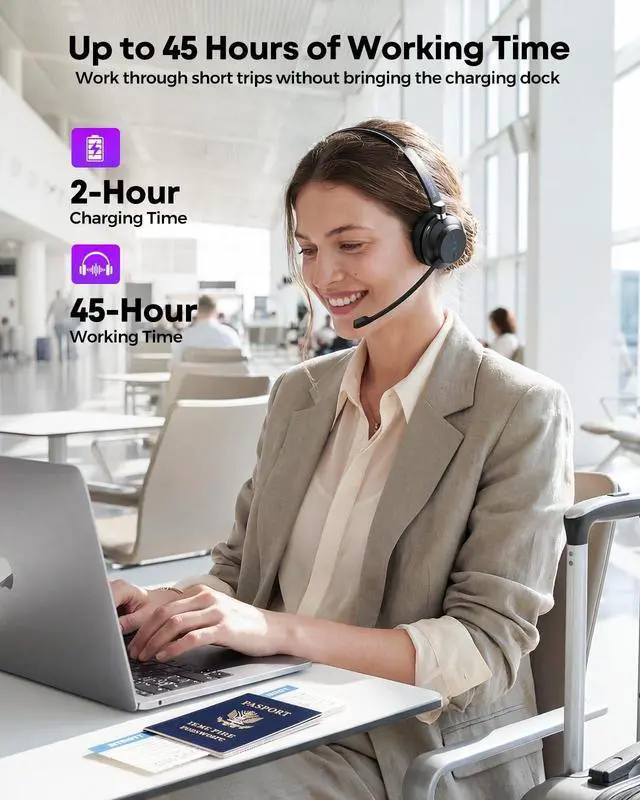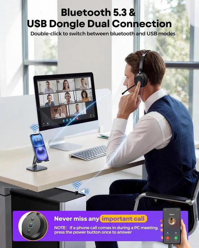 A 270 rotatable microphone allows left or right side wearing, providing ergonomic comfort and clear audio during calls, meetings, or online classes. ^^ Dual Connectivity OptionsEffortlessly switch between devices with this Bluetooth headset featuring Bluetooth 5.3 and a plug and play USB dongle. Simply double click the power button to toggle between Bluetooth mode and USB mode. When you are in a video meeting on your PC and receive an important call on your phone, just press the power button to answer instantly, so you never miss a call. ^^ Up to 45 Hours Battery LifeThis computer headset with microphone supports fast charging, delivering up to 45 hours of working time with just a 2 hour charge.