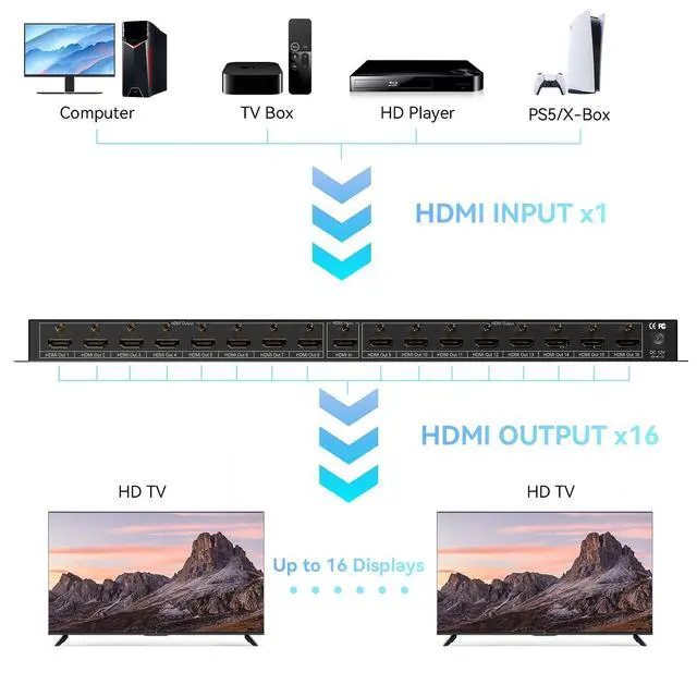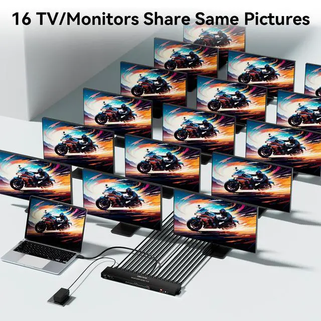 HDMI Splitter 1 in 16 OutIdeal choose for Duplicating 1 HDMI Signal Input to 16 Monitors or TV Display Screens. Perfect for Bars, Restaurants, Churches, Gyms, Office, classrooms or any other spaces needing to duplicate one display to eight screens.
