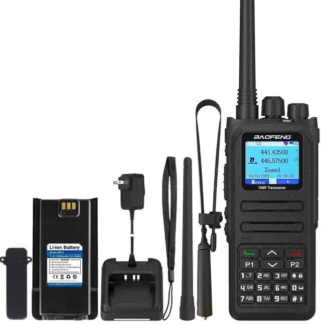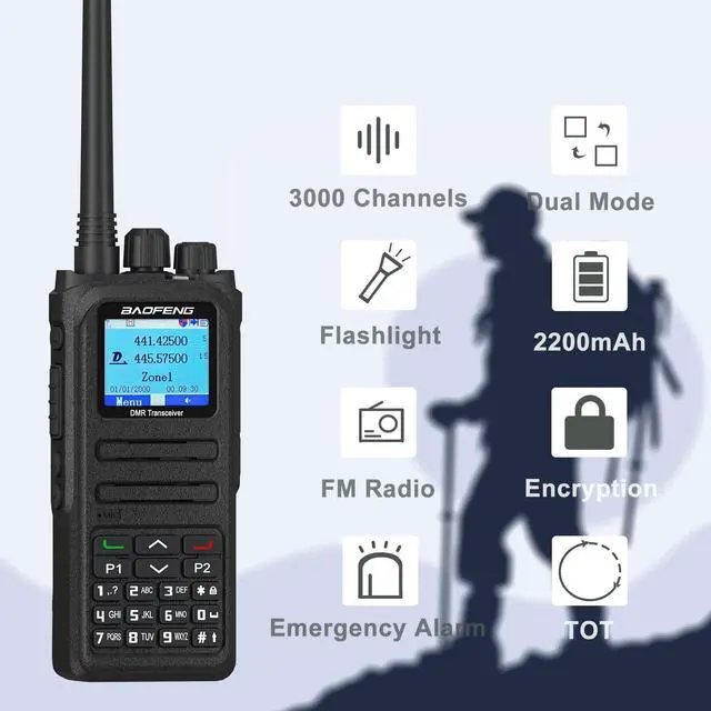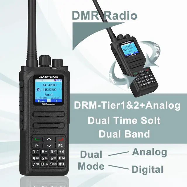 FeaturesBroadband walkie talkie: Support UV double segmentHigh sound quality: DM-1701A uses advanced AMBE +2TM voice processingtechnology to achieve high qualityManual writing-frequency: Supports channel / frequency mode, allows manual writing-frequency infrequency mode, and writing-frequency software can be used to set therequired frequency without connecting the computerAlarm function: Supports general alarm and silent alarm in emergency situationsDigital mode supports the use of relaysSide buttons can be customized without changing the user' soperating habits