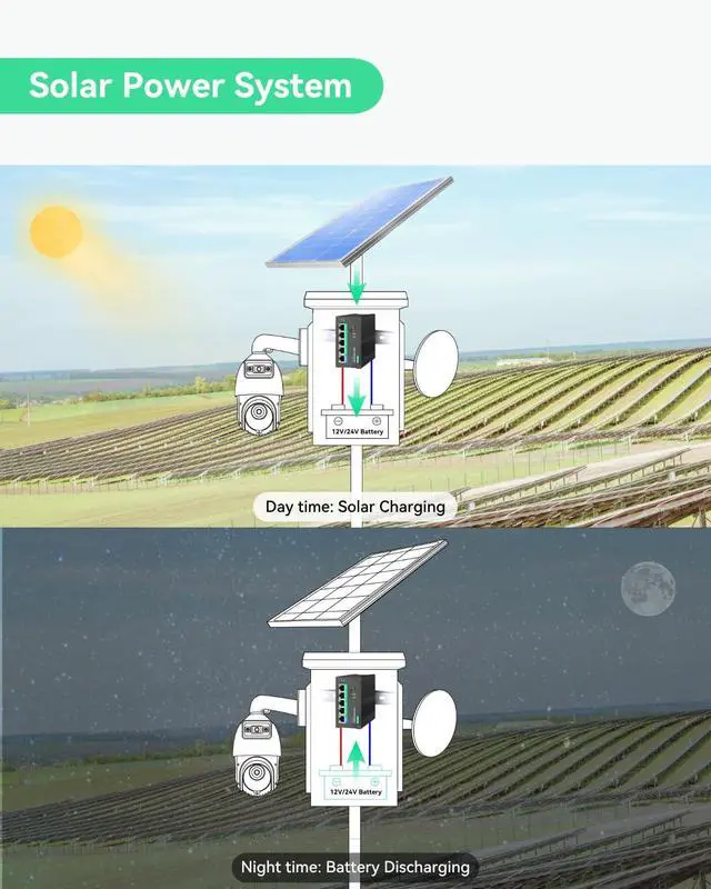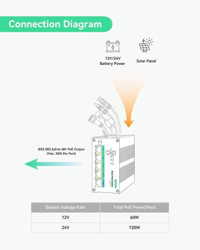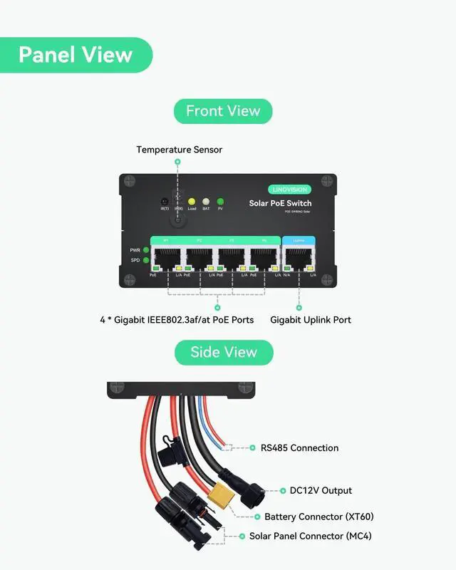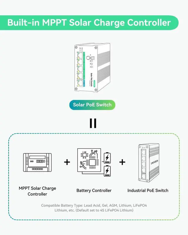 Note: This switch automatically detects 12V or 24V DC system voltages (non-lithium battery types). Default setting is 12V LiFePO ^^ SMART BATTERY MANAGEMENT - Local battery status LED indicator and remotely battery management, compatible to battery types (Lead Acid, Gel, AGM, Lithium, LiFePO4 Lithium, etc. ). Automatically detects 12V or 24V DC system voltages (for Non-Lithium battery types). 10A output current. ^^ 99% EFFICIENT CHARGING - MPPT (Maximum Power Point Tracker) charging technology with up to 99% tracking efficiency and 98% peak PV conversion efficiency. It is much better than traditional PWM controllers, especially in cloudy days. ^^ 5-PORT FULL GIGATBIT PoE SWITCH -Provide 4 IEEE 802.3 af/at 30W POE ports and 1 Gigabit uplink; All ports 10/100/1000Mbps self-adaptive full duplex; Total POE budget is 120W@24V or 60W@12V. ^^ REMOTE MONITORING via RS485 - Supports RS485 ModBus for remote monitor and control, enabling you to monitor the status of your solar panels/solar trailers/solar powered cameras on the go. It can be managed in Linovision RemoteMonit Cloud Platform (bundle with