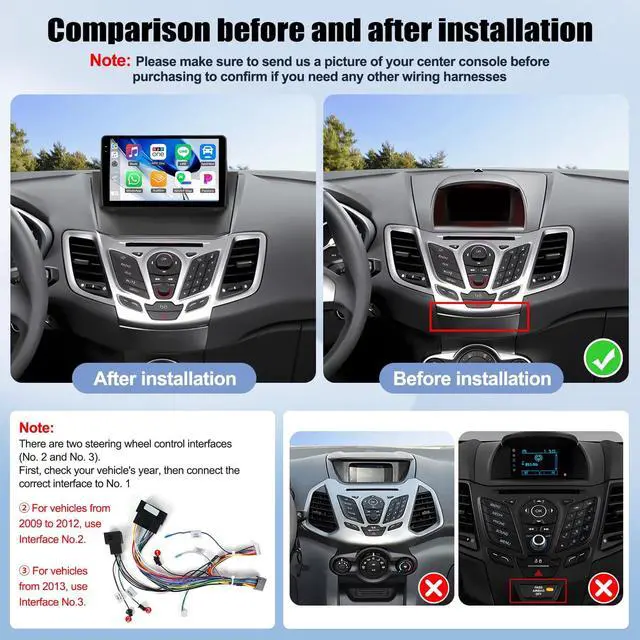 Applicable Car ModelsFord Fiesta 2009-2014noteOur android car radio doesn't fit the following 3 types of center consoles: 1. There is a airbag button under the center console; 2. Your car with J. B. L or B. O. S. E or S. O. NY premium audio 3. The center console has no screen. If you are not sure whether our radio is suitable for your car, please send us your car's model, year and a car dashboard picture by chat, we will help you to check if this car stereo is suitable for your car ^^ Wireless CarPlay & Android AutoSimply connect your iPhone/Android phone to the Android car radio via Bluetooth. By using Siri's intelligent voice assistant or touch screen, you can get directions, make phone calls, send and receive messages, and enjoy music, among other things. A smarter, safer, and more fun way to use your phone in the car, keeping you focused, connected, and entertained ^^ Bluetooth & FM RadioAnswer/ make calls and be hands-free with no distractions. The built-in microphone picks up your voice and your car speakers let you hear the person on the other side.