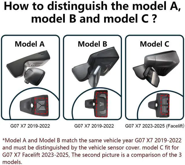 Difference of Model A & B & CThe model A and model B match the same vehicle year G07 X7 2019-2022 and must be distinguished by the interior rearview mirror. Model C only needs to be distinguished by the year of the carG07 X7 Facelift 2023 2024 2025 ^^ Custom fit for BMW G07 X7 2019-2022Mangoal 4k dash cam can fit perfectly behind the rear view mirror like original. No messy wiring exposed, no complicated rewire at all. Perfectly intergrated with BMW G07 X7 2019-2022 (Model A), M50i xDrive40i xDrive50i ^^ 4K Image and Ultra HD 2160P VideoUpgraded with f/ 1.8 big aperture lens and CMOS IMX335 chip to enable high-definition video at 2160P/30fps, Mangoal OEM style dash cam for can provide 4K image performance in all aspects.