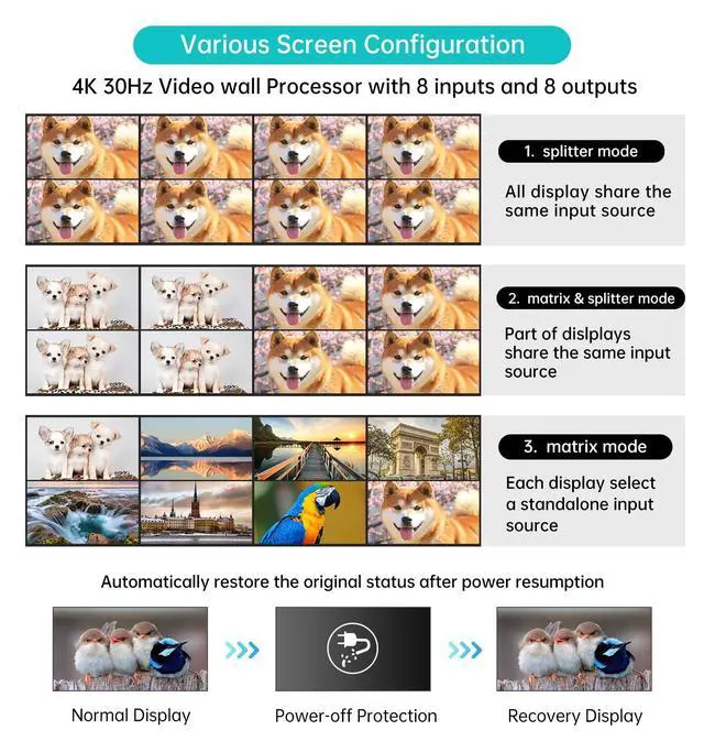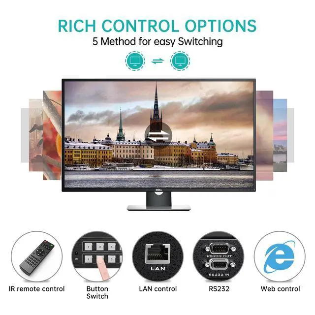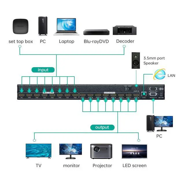 ^^ 4K Resolution: This hdmi matrix 8 in 8 out supports resolution up to 4K 3840*2160@30Hz, 8KV ESD protection. Support Local LAN control from other computer by installing MatrixController.